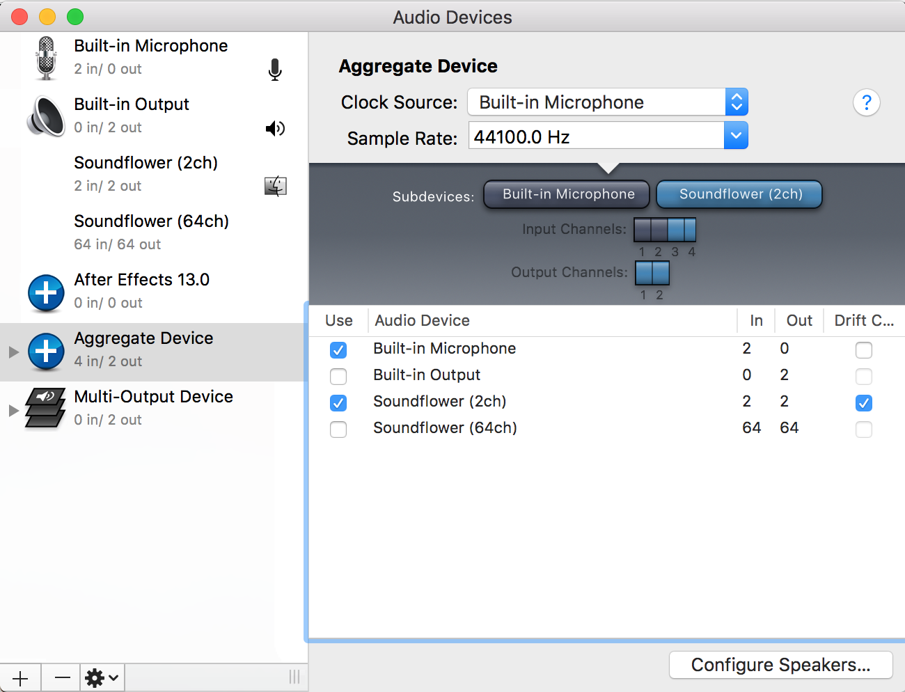 Repeat the procedure above but this time create an aggregate device (mixing input and output into a single interface) combining your microphone and the newly created output device.