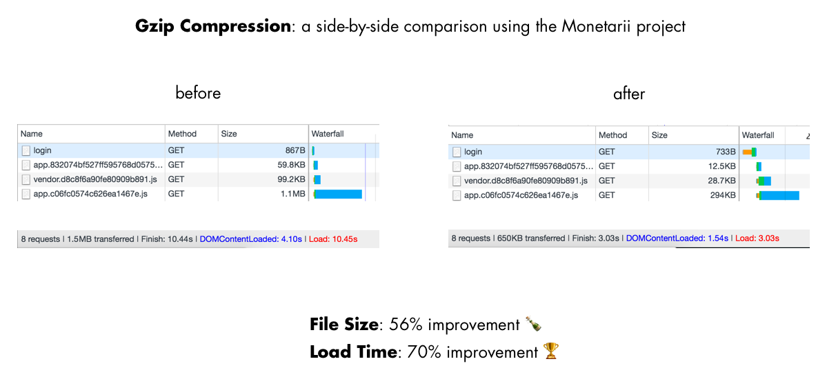 Gzip is a compression method: it diminishes the size of a file as it is downloaded by the user, and uncompressed on the user’s browser (which is very fast). On Monetarii, a Theodo project, page size was improved by 56% and overall load time decreased by 70%!