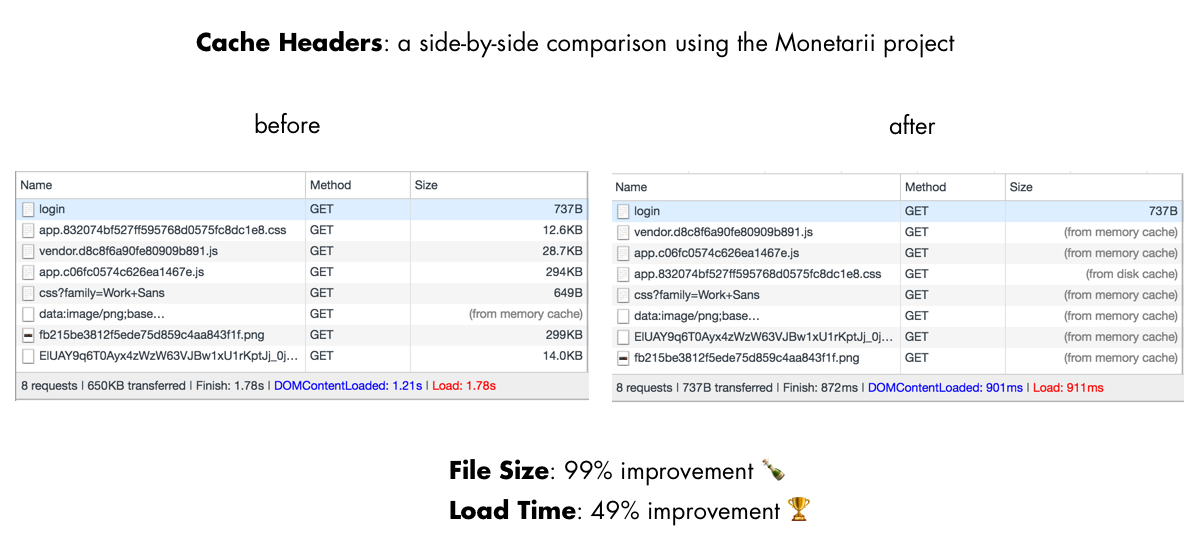 Caching allows a browser to “save” some files locally and not download them every single time a user comes to your website. As an example, a landing page hero image is unlikely to be updated every five minutes — so it makes sense to tell the browser “please keep this image in the cache and only check once a day if it’s been changed on our side”. You can then reduce the number of network calls (and the overall download size) the browser is making. On Monetarii, a Theodo project, (downloaded) page size was improved by 99% (everything could be cached) and overall load time decreased by 48%!