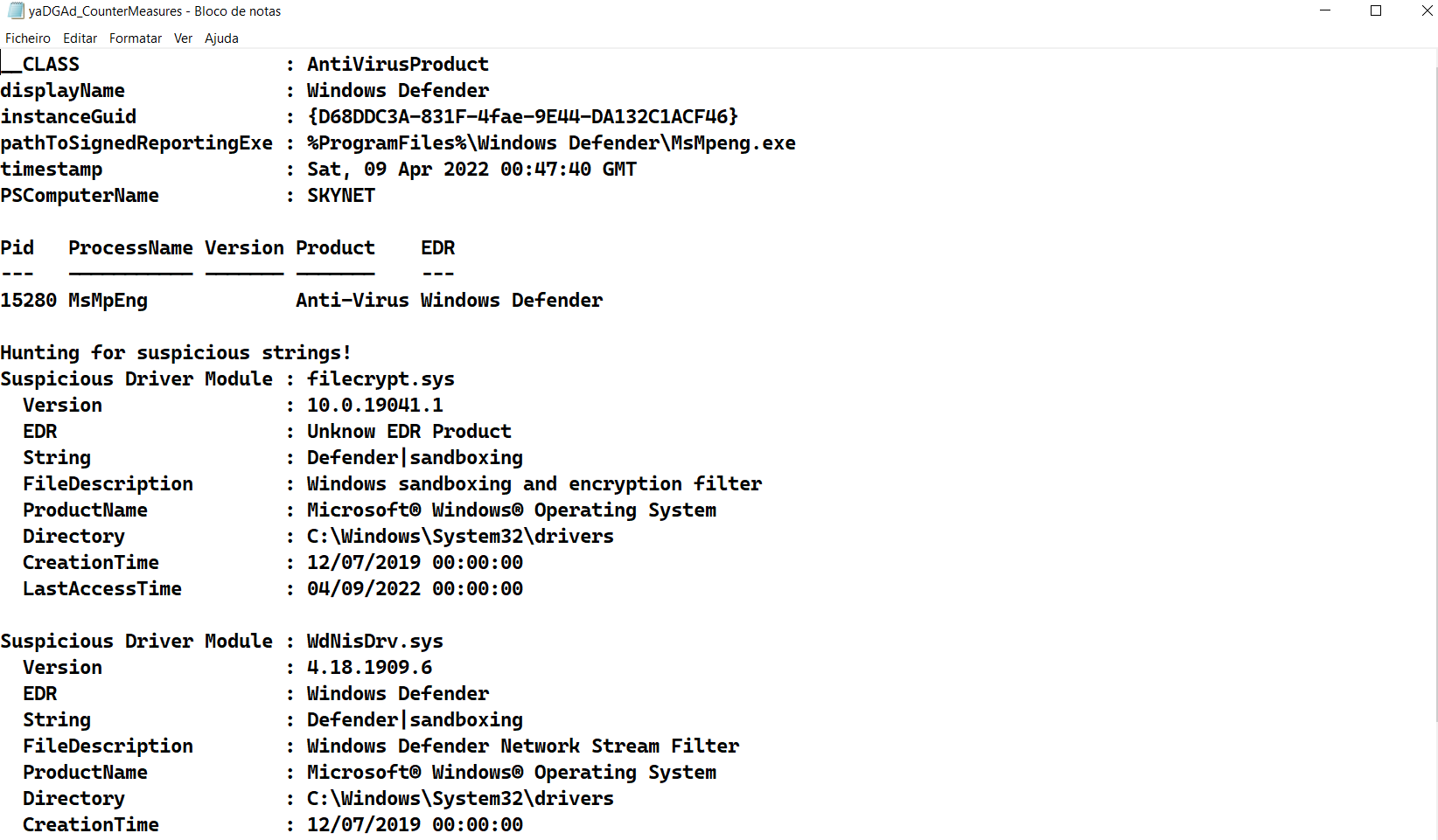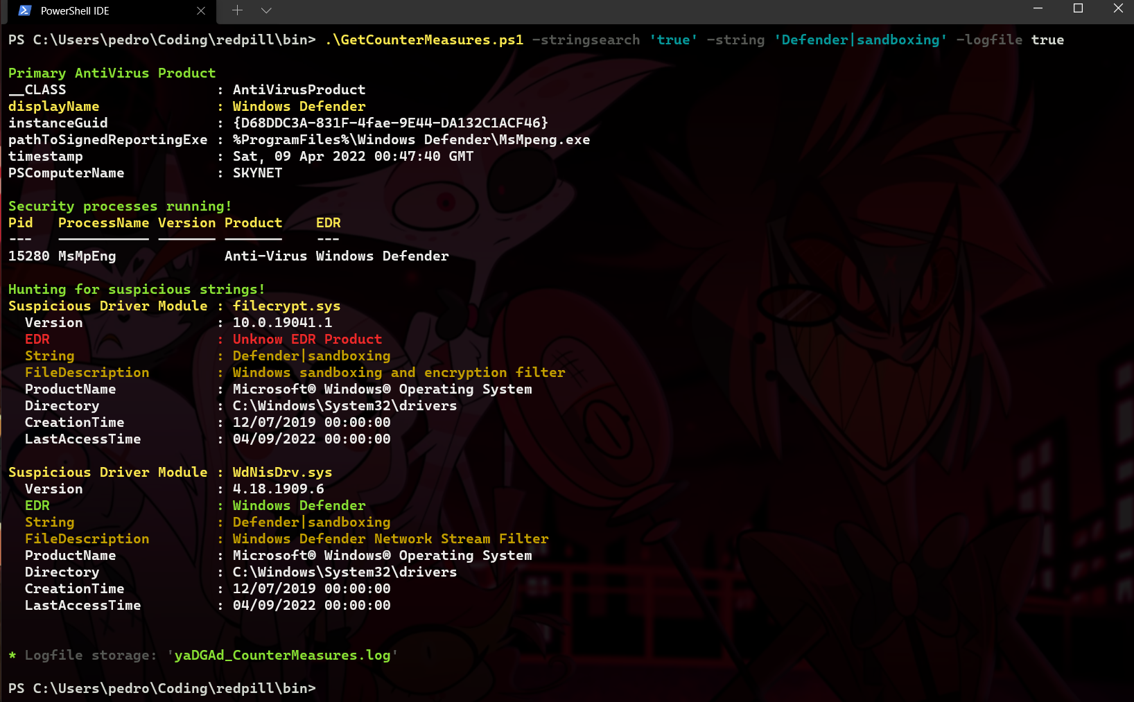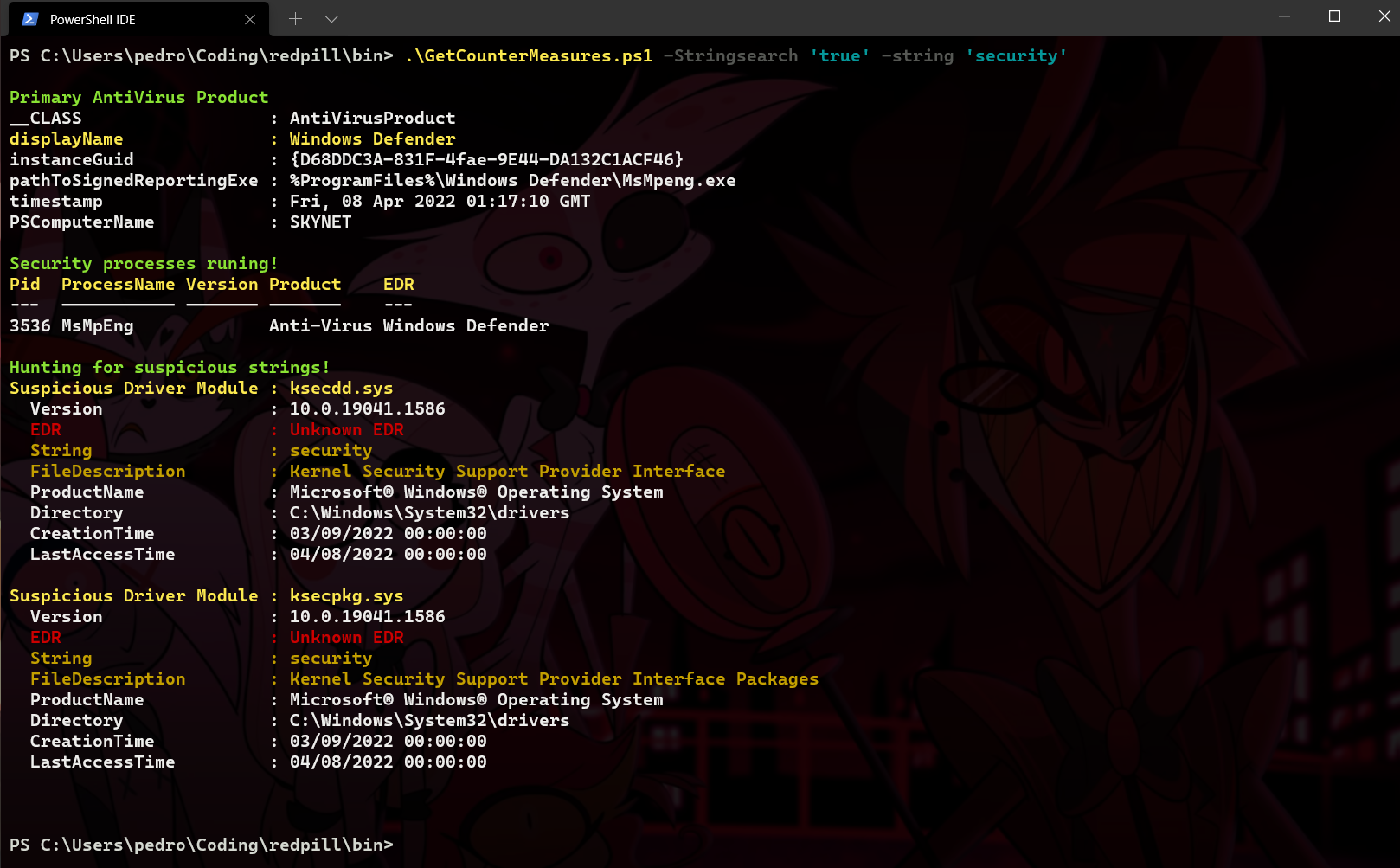 | PS C:\> .\GetCounterMeasures.ps1 -stringsearch 'true' -string 'Defender' | |