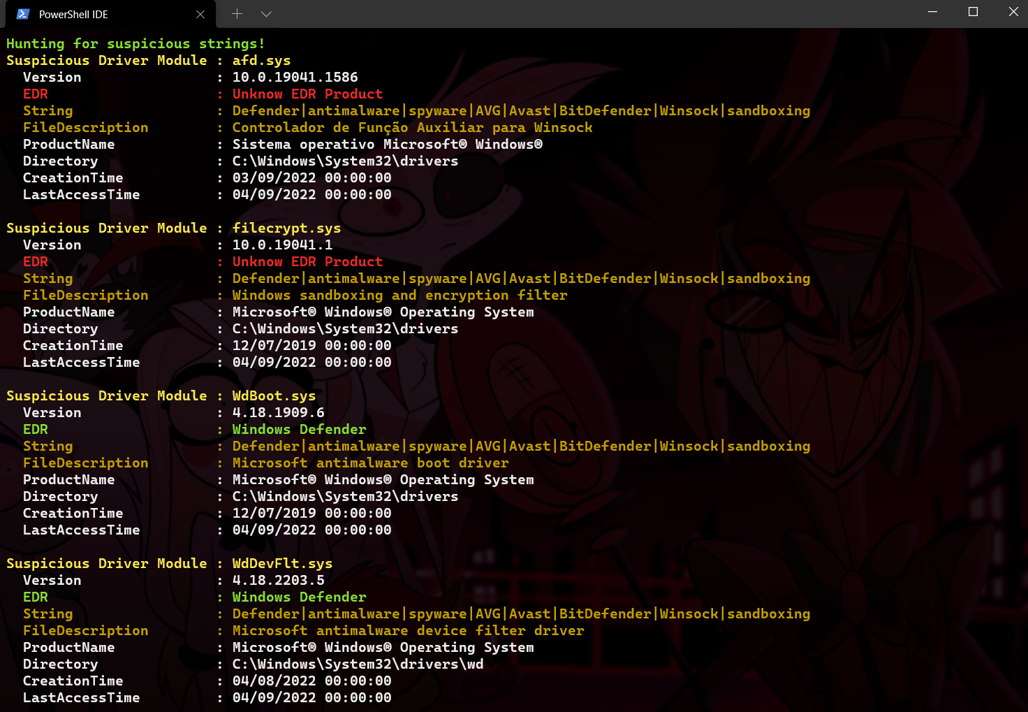 | write-host " No known EDR drivers found that match search criteria.." -ForegroundColor DarkGray; | |