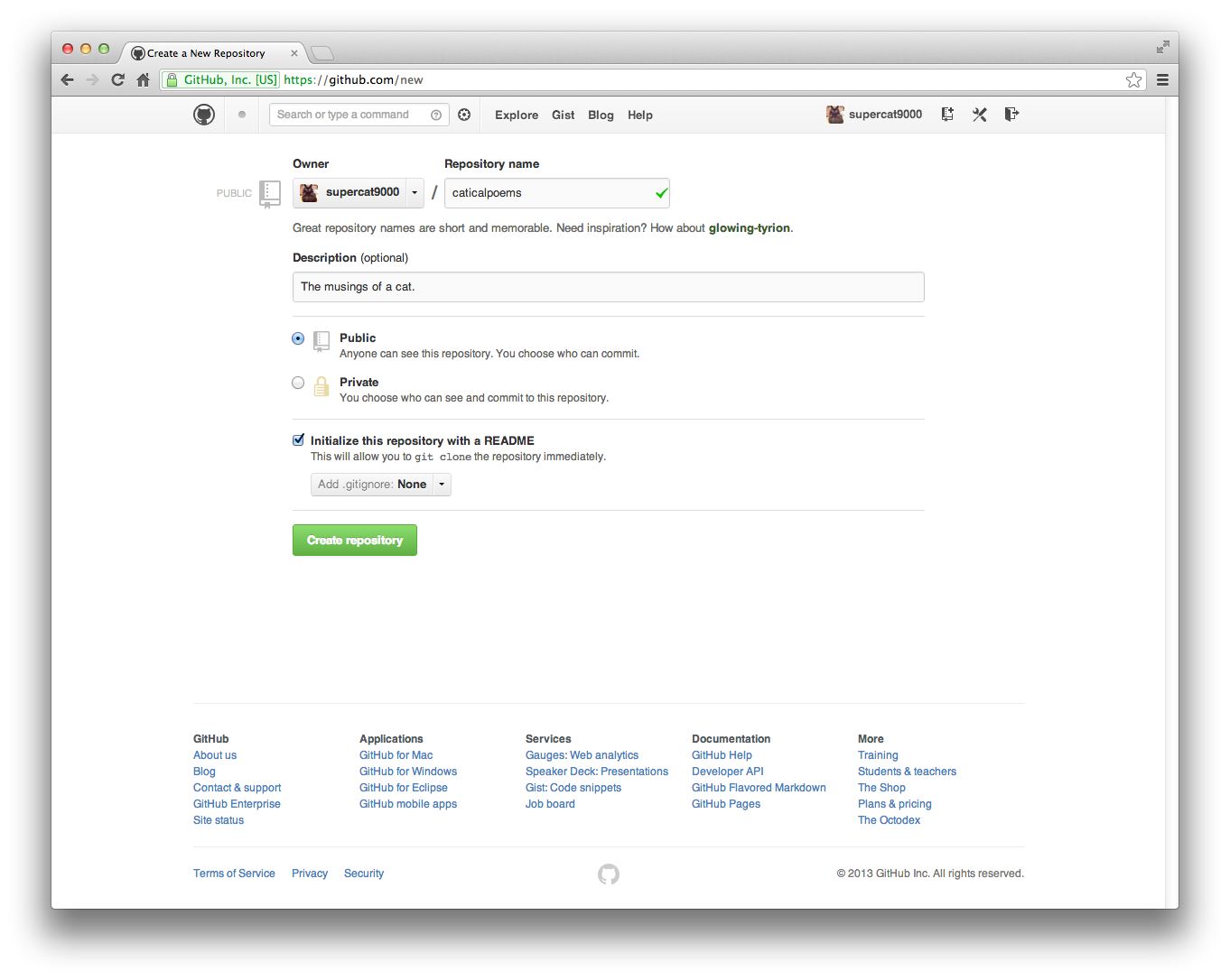 It turns out that along with being a super-cat, supercat9000 is also a poet. Sort of. He can add his own poems to his new repository, caticalpoems. Press the new file button like you did with the fork earlier, and write up something: