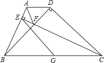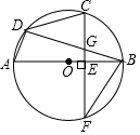 - (19绵阳) 如图,AB是⊙O的直径,点C为$\overset{\LARGE{\frown}}{BD}$ 的中点,CF为⊙O的弦,且CF⊥AB,垂足为E,连接BD交CF于点G,连接CD,AD,BF.若AD=BE=2,则 BF=___. [2sqrt3]