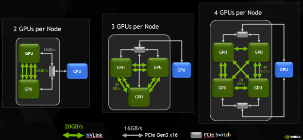 NVLink is a high-throughput interconnecting technology from Nvidia for directly connecting two GPUs. It provides a much faster & more configurable solution to GPU-GPU data transmission than the PCIe-switch-mediated one. Below is the image of a PCIe switch board and an example of using NVLink in three configurations.