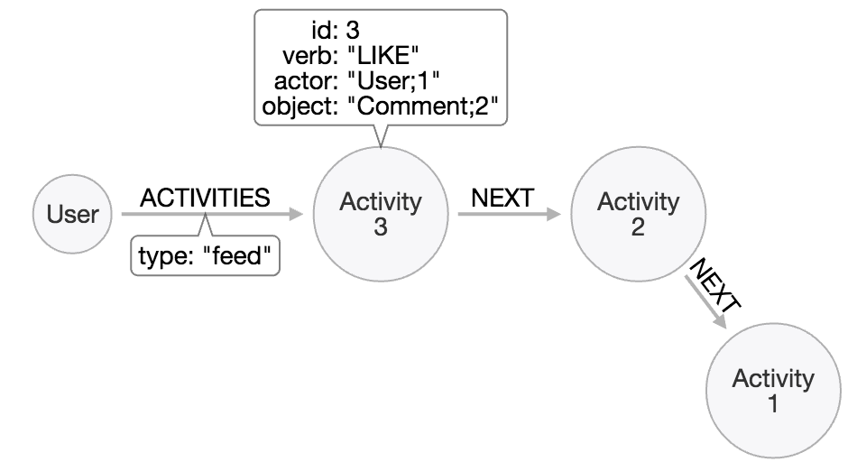 This is similar to #2 because activity nodes (called feedItem) have actor and target as subnodes and so it has the same pros/cons. However, what is interesting here is the graph optimisation technique used here. Each activity is linked to the next activity with the latest activity linked to the feed group. As opposed to the conventional approach of linking each activity directly to the user or feed group, this makes scanning and pagination very efficient since all that is needed is to follow the path across [:NEXT] edges. activity insertion or deletion means, breaking the chain to insert the new node to delete an existing one.