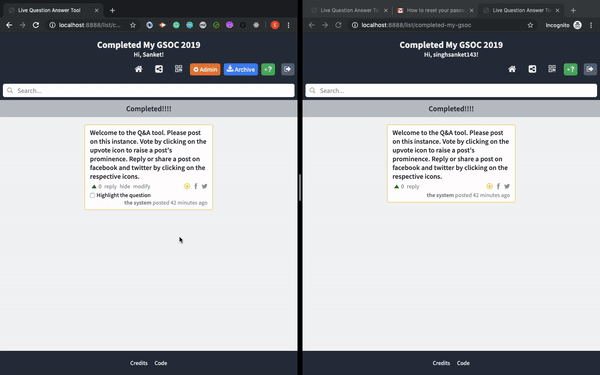 This was again one of the most interesting and challenging part of my project. This was one part of the summer which took quite a lot of time which I didn’t think that it would take. It was not very straightforward, given the constraints that overall efficiency should be maintained. In this feature a Remote Control of a projected instance from another device was required to be built. The admin was supposed to be able to highlight the corresponsing questions of an instance in real-time without any refresh of the web page occuring. To implement the real time remote control of the instance Web Sockets were taken into use.