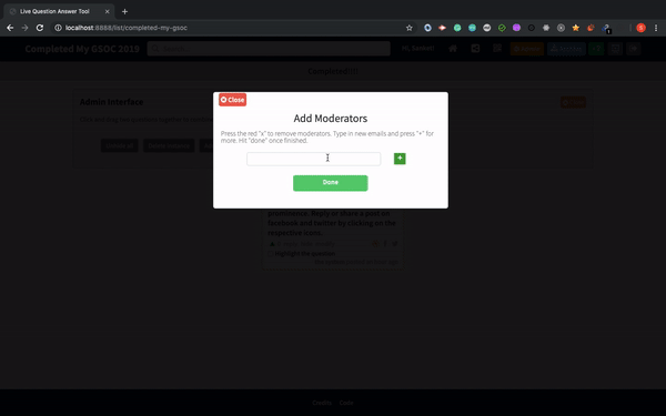 This feature heavily depends on event driven programming nature of JavaScript. The Streamy.broadcast event was used to do broadcasting i.e. Send a message to every connected sessions. Using this we emitted the emphasize or de-emphasize events which were then caught using Streamy.on event which registers a callback for a specific event either emphasize or de-emphasize. The callback will be called when a message of this type has been received. In the callback we updated the corresponsing CSS of the question targetted by the admin.