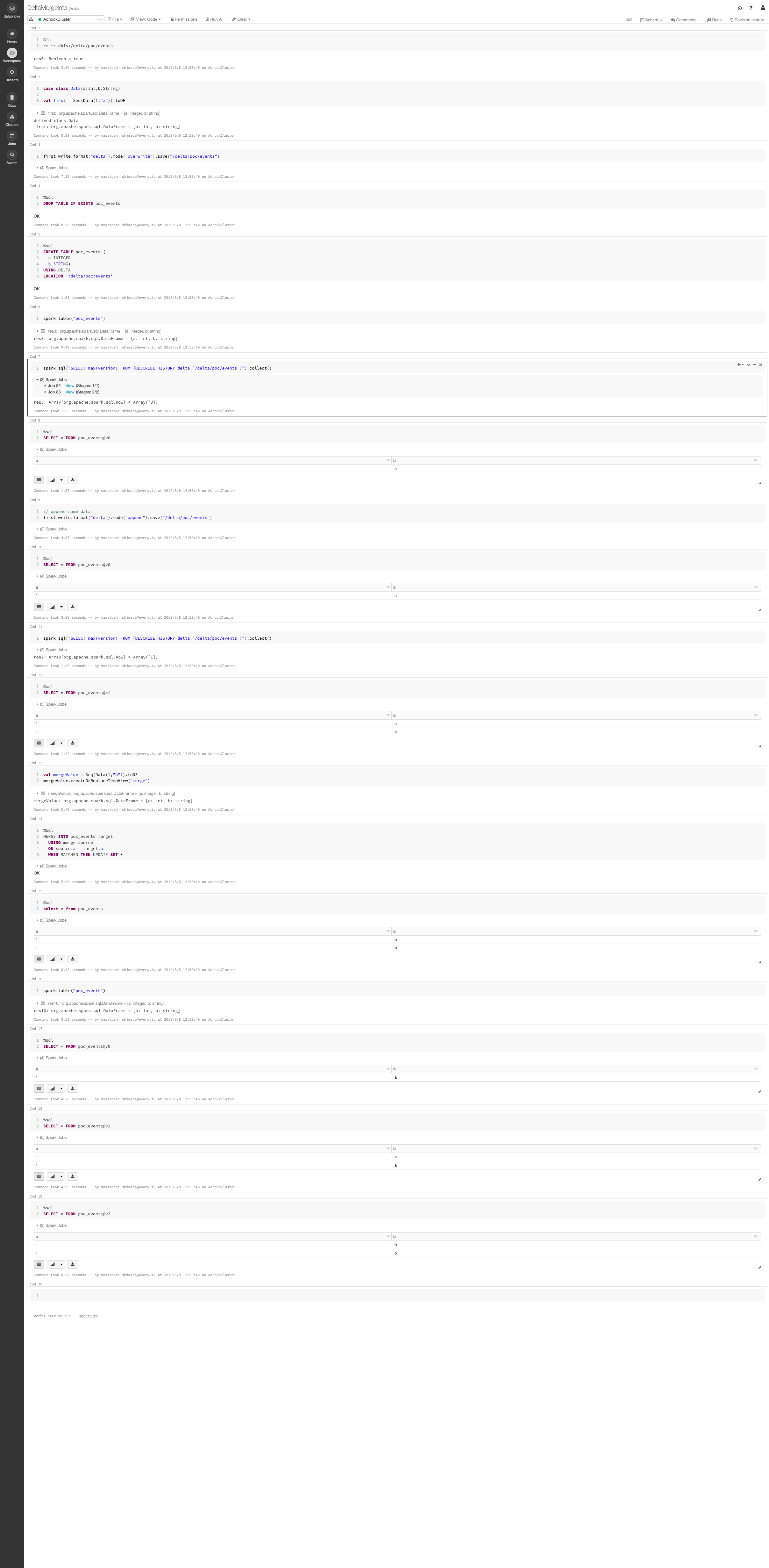 spark.sql("SELECT max(version) FROM (DESCRIBE HISTORY delta.`/delta/poc/events`)").collect()