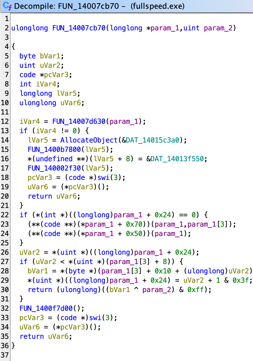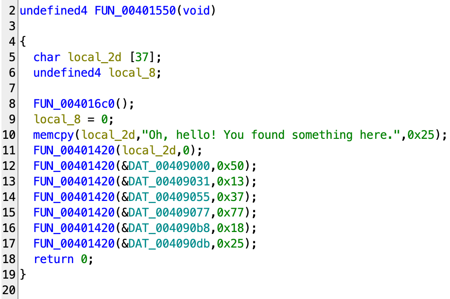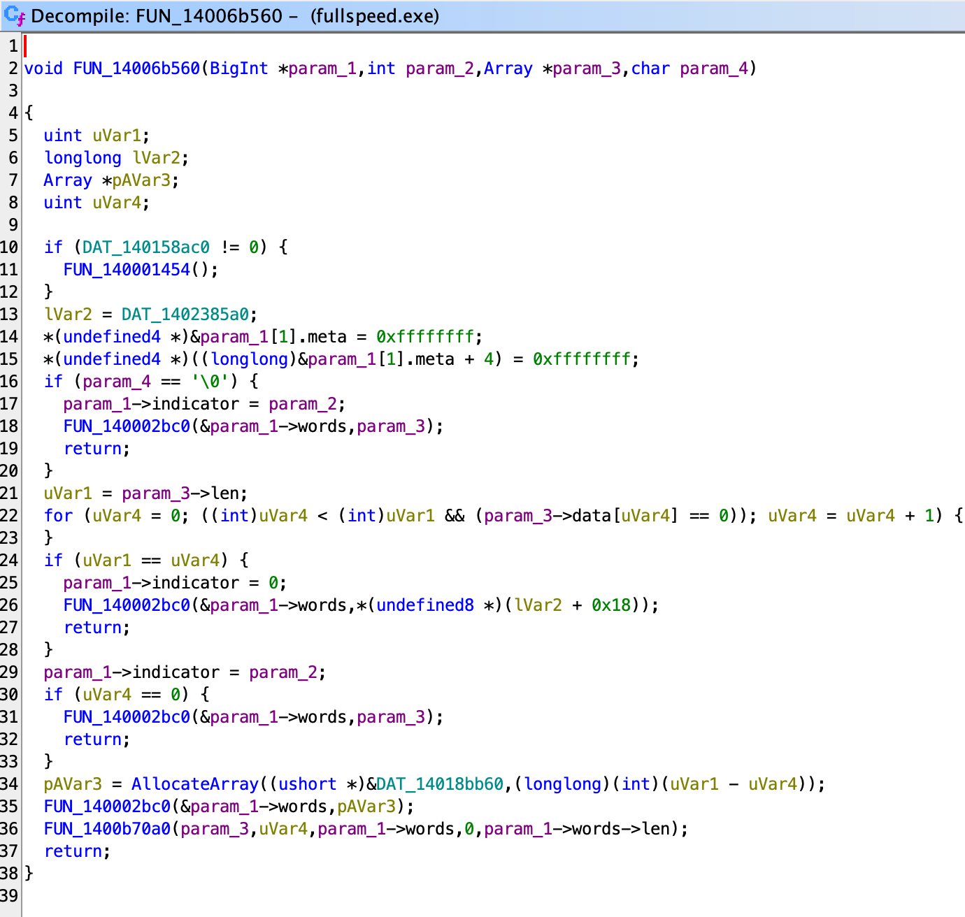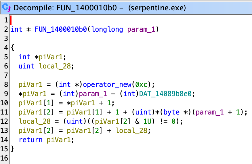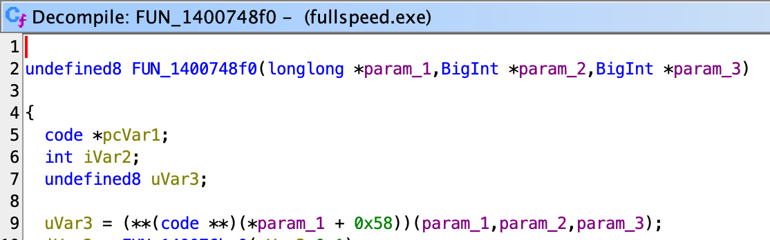 However, although Ghidra (and IDA) claims to have good Golang support, in real situations like this one, I found that the decompiled code is still a bit hard to read. The strings are not processed good enough, and function call arguments and return values are all over the place because of the non-conventional calling convention.