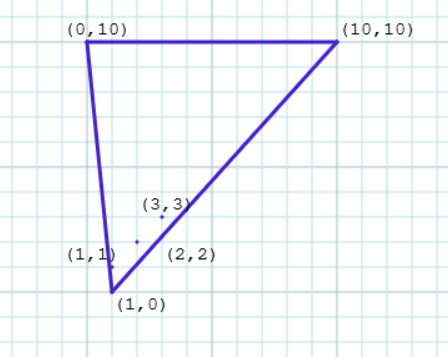| ConvexHull *ch = new ConvexHull({{1,1},{2,2},{1,0},{0,10},{10,10},{3,3}}); | |