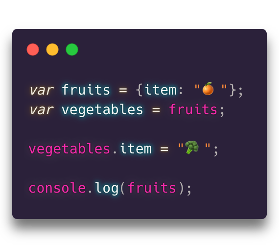 | A. {item: "🥦"} | The output will {item: "🥦"} because we're dealing with objects here. Objects are passed by reference, that is, fruits and vegetables point to the same object in memory 🧠 |