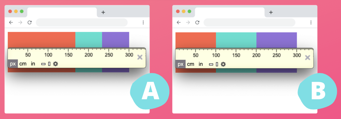 | A 馃帀 | A veces, configurar flex-grow, flex-shrink y flex-basis por separado es agotador. Para los programadores perezosos, digo, para los programadores eficientes 馃槣 se puede configurar los 3 con la abreviatura flex -> flex: flex-grow flex-shrink flex-basis (por defecto es flex: 0 1 auto). En este caso, tomato crece 1 (como los otros elementos), no se contrae (porque hay espacio suficiente) y define un tama帽o adicional de 100px antes de que se distribuya el espacio restante. Eso significa que el elemento tomato primero tiene un tama帽o de 100px y el espacio restante (200 px) se distribuye en 3 partes iguales para tomato, turquoise y mediumpurple. |