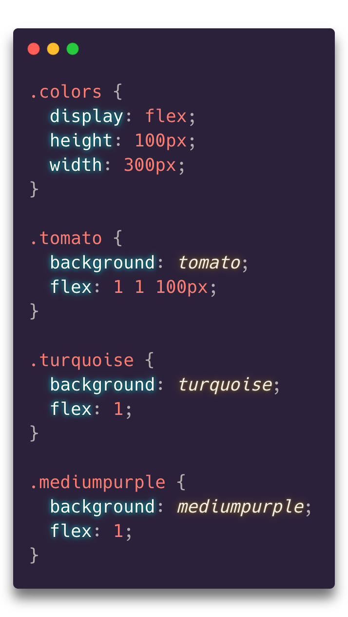 | A 馃帀 | Sometimes, setting flex-grow, flex-shrink and flex-basis separately are tiring. For the lazy programmers, I mean the efficient programmers 馃槣 You can set all 3 with the flex shorthand -> flex: flex-grow flex-shrink flex-basis (by default is flex: 0 1 auto). In this case, the tomato grow 1 (like the other elements), it does not shrink (because there are enoght space) and it defines an aditional size of 100px before the remaining space is distributed. Thats mean, the tomato element first has a size of 100px and the remaining space (200px) is distributed in 3 equal parts for tomato, turquoise and mediumpurple. |