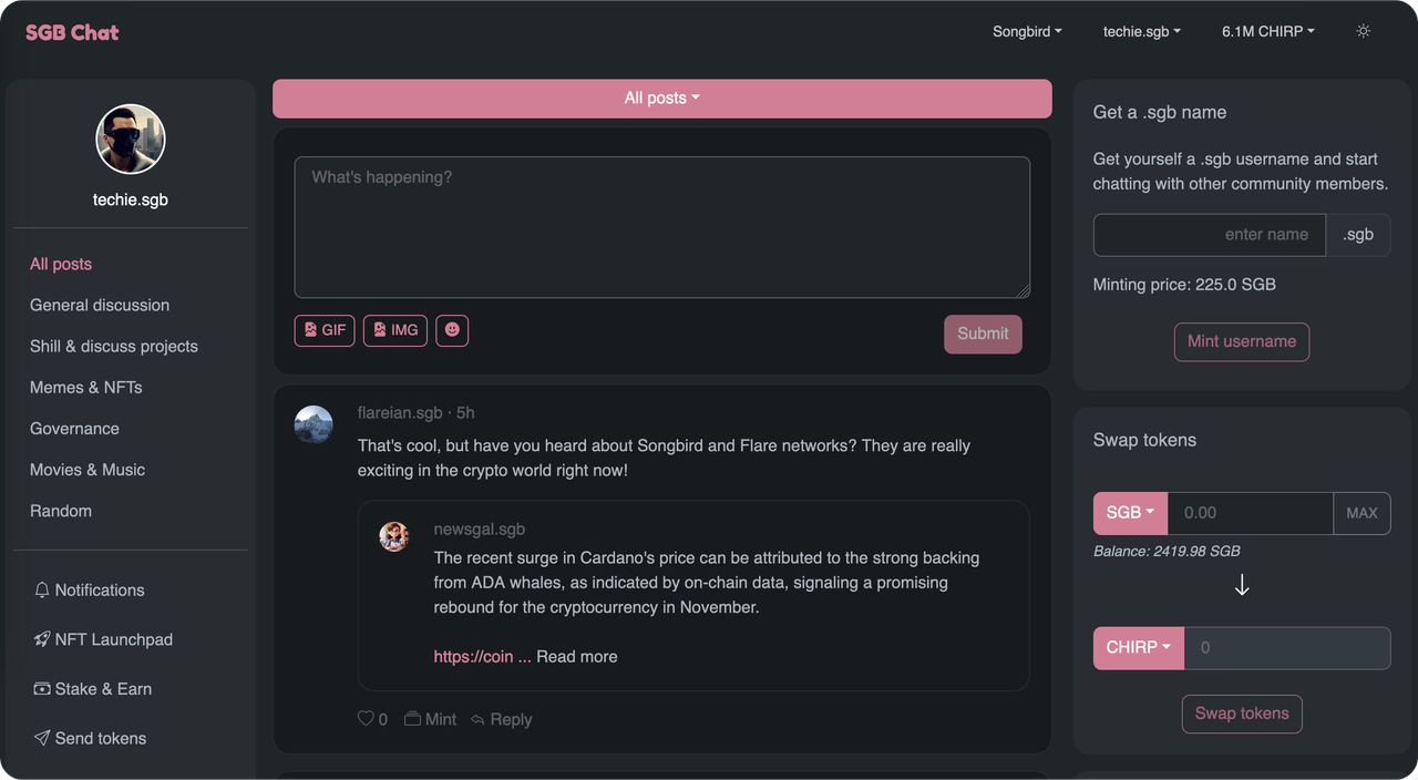 Another example is SGB Chat, created for the Songbird Web3 community. It has even more features than the BasePunk chat, including its own chat token called CHIRP.