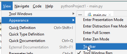The first thing to do to make your life a little easier is go to View -> Appearance -> Toolbar: