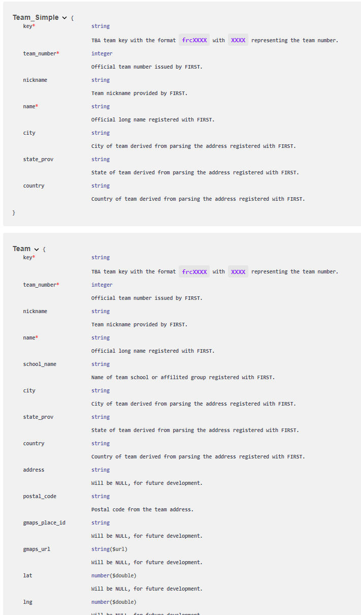 Clicking on each of those tells you what type of data they each return - in this case, the first method returns a Team object, while the second returns a TeamSimple object. To find out what these mean, scroll all the way down to the bottom of the TBA page to find these: