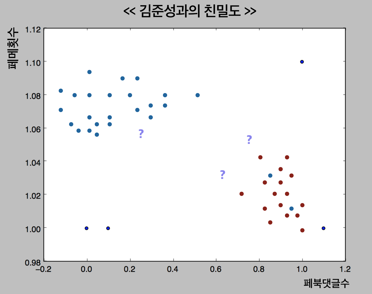 한번 그래프를 잘 보면 친한 친구와 친하지 않은 친구가 군집화되어있음을 볼 수가 있다. 따라서, 준성이와 다른 친구들간의 거리를 계산해서 준성이 주변에 있는 친구의 분류를 보면 그에 따라 준성이의 분류를 예측할 수 있을 것이다.