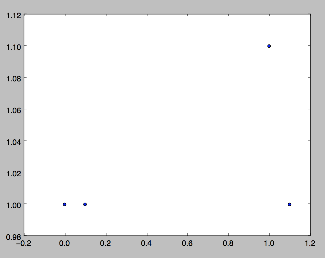 group, labels = kNN.createDataSet()데이터세트에 무엇이 들어있을까? mathplot 라이브러리를 이용해 그래프화할 수 있다.