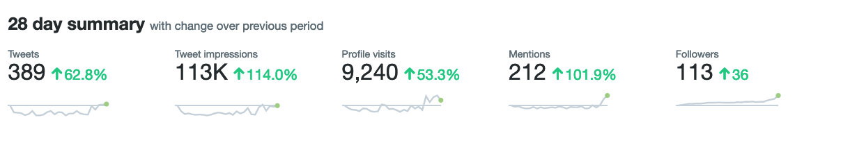 I also got about 113K impressions and 9k profile visits. Most of these hits are due to tweets and replies not relating to my blog posts, but the process for creating tweets and posts is pretty similar, so I consider these outputs of one process.