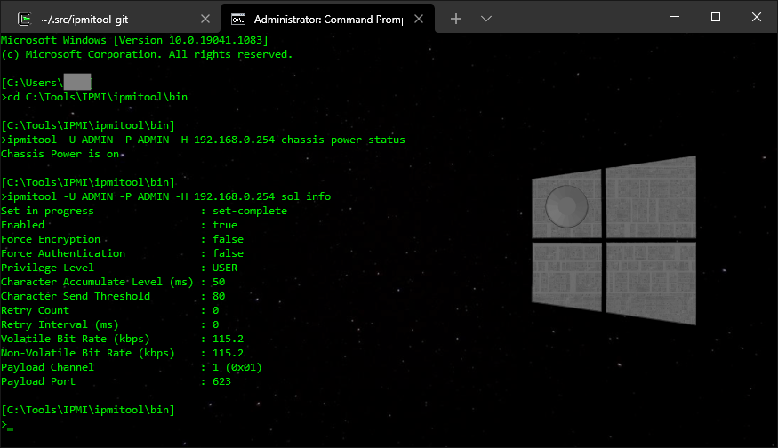 $ ./ipmitool.exe -U ADMIN -P ADMIN -H 192.168.0.254 chassis power status