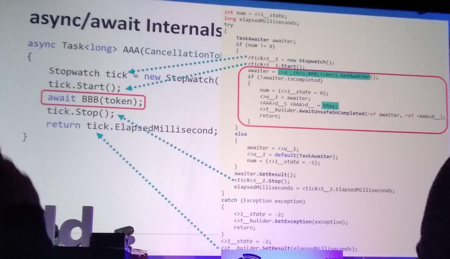 awaitable type must be able to returnGetAwaiter()with the following: implementsINotifyCompletion,bool IsCompleted { get; },TResult GetResult()asyncmeans nothing, it only instructs the compiler to create a state machine- we can make any type awaitable using extension methods