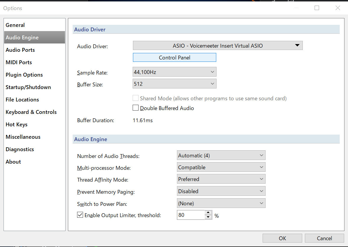 - Audio Driver : ASIO - Voicemeeter Insert Virtual ASIO