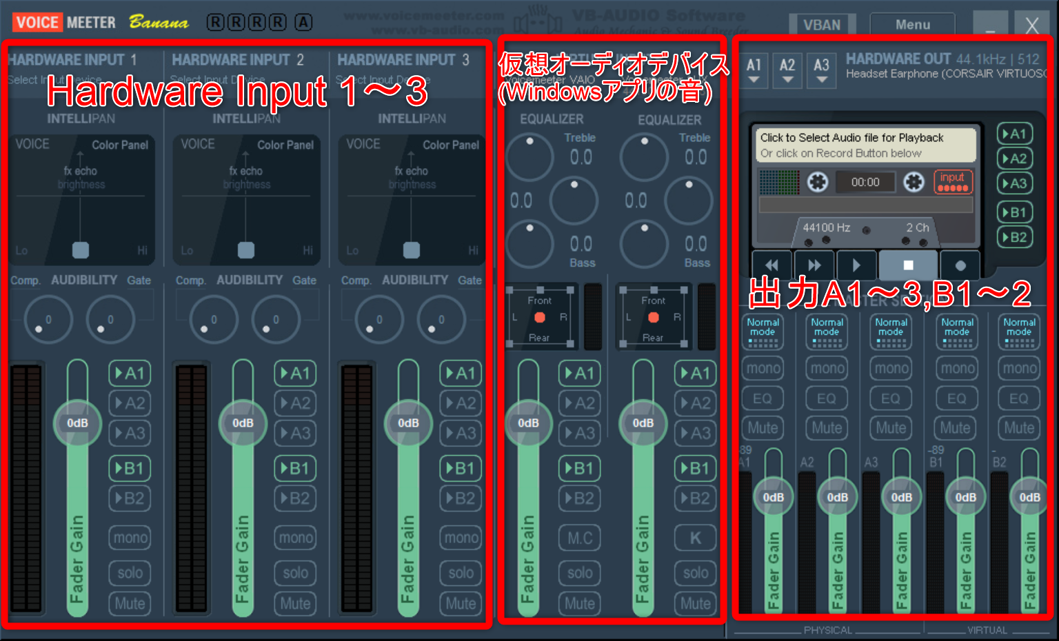- 出力 B1~B2 : Voide Meeter Bananaで加工した音を仮想マイクデバイスとして出力できる