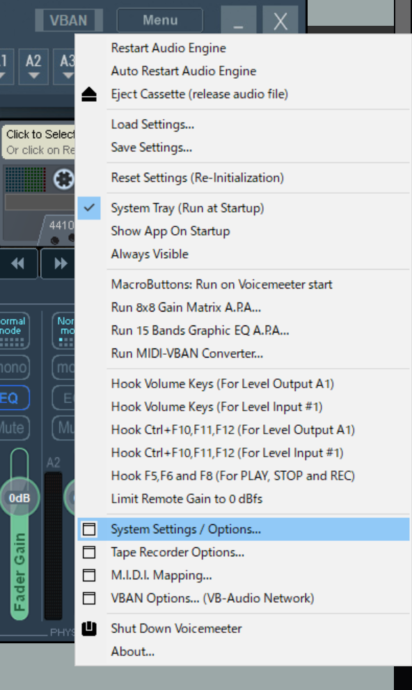 - Voice Meeter BananaのMenu→System Setting/Optionsを選択