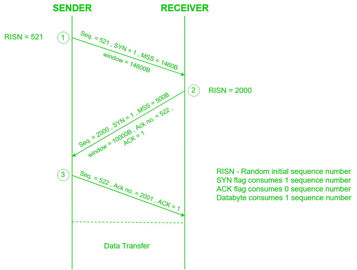 Sender starts the process with following: Sequence number (Seq=521): contains the random initial sequence number which generated at sender side. Syn flag (Syn=1): request receiver to synchronize its sequence number with the above provided sequence number. Maximum segment size (MSS=1460 B): sender tells its maximum segment size, so that receiver sends datagram which won’t require any fragmentation. MSS field is present inside Option field in TCP header. Window size (window=14600 B): sender tells about his buffer capacity in which he has to store messages from receiver.