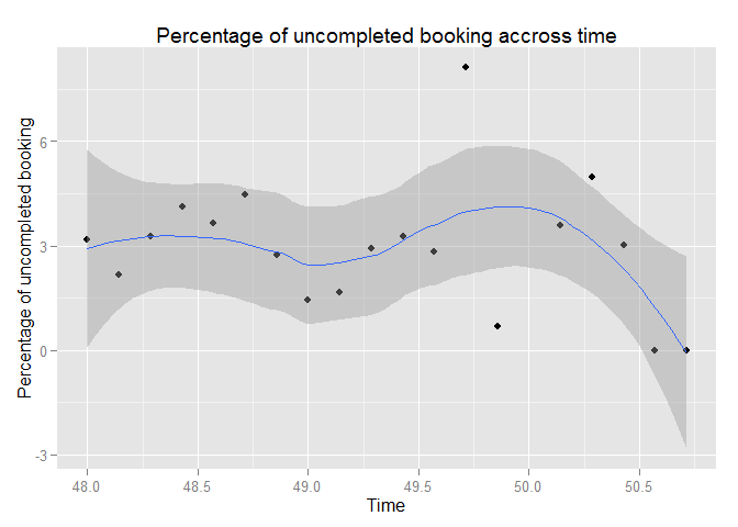 ggplot(data=metric.retention,aes(x=date_event,y=perc))+geom_point()+scale_x_continuous(breaks=seq(min(metric.retention$date_event),max(metric.retention$date_event),0.5))+geom_smooth()+xlab("Time")+ylab("Percentage of uncompleted booking")+ggtitle("Percentage of uncompleted booking accross time")## geom_smooth: method="auto" and size of largest group is <1000, so using loess. Use 'method = x' to change the smoothing method.