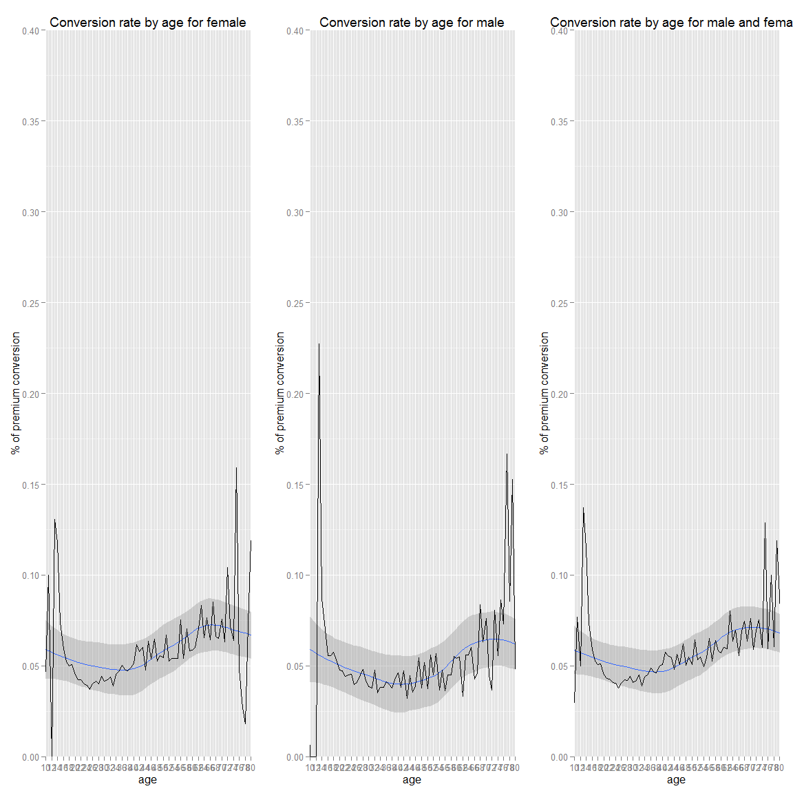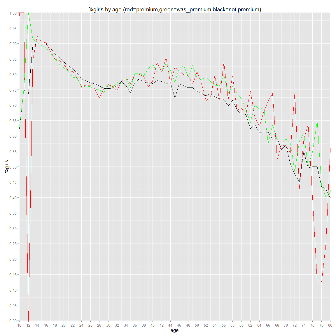 g.fc_gender.noprem+geom_line(data=ds.age.fc_gender.prem.wide,aes(x=age,y=percentF),colour="red")+geom_line(data=ds.age.fc_gender.nopremanymore.wide,aes(x=age,y=percentF),colour="green")+ggtitle("%girls by age (red=premium,green=was_premium,black=not premium)")We can see that in proportion we have more girl than guys that are premium than not. Moreover, girls tend to convert more than guy especially when they get older. Therefore, girls who try our product are more likely to become premium members. Finally, we can see that there are more boy than girls that join our website as they get older. An assumption could be that they do register for their kid and the male do it as (regretfully) male still have the more income than women in average in couple (at least in Europe: http://www.theguardian.com/world/2014/mar/06/french-married-women-earn-less-male-partners).