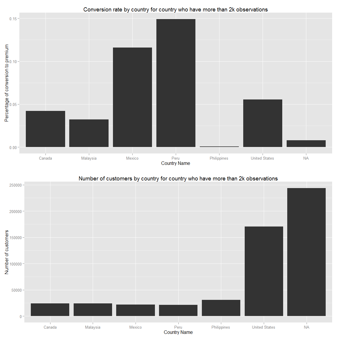grid.arrange(g.premium.conversion,g.premium.nbObservation,ncol=1)As we have seen so far, Peru and Mexico have very high potential since their conversion rate are the highest. Canada and the USA are following them. However, the USA has way more customer than the others. Therefore, focusing on them primarely make sens. Additionally, we should look into demographically where these users are to do special targeting campaign only for these cities.