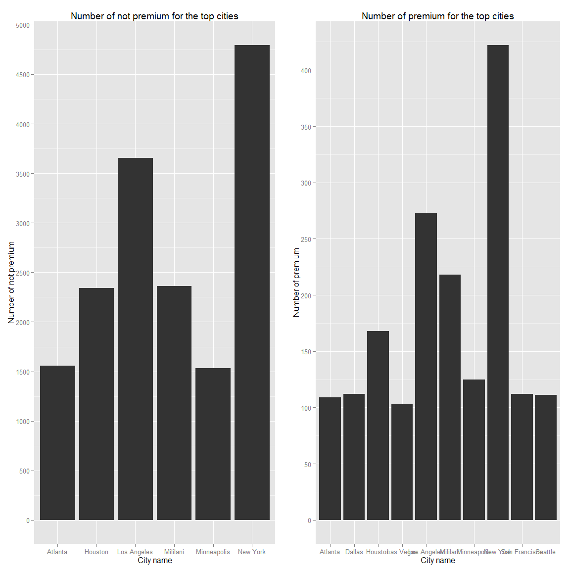g.zip.not_prem.city<-ggplot(data=filter(ds.zipmap.not_prem.plot,value>1500),aes(x=city,y=value))+geom_histogram(stat="identity")+scale_y_continuous(breaks=seq(0,30000,500))+ggtitle("Number of not premium for the top cities")+xlab("City name")+ylab("Number of not premium")