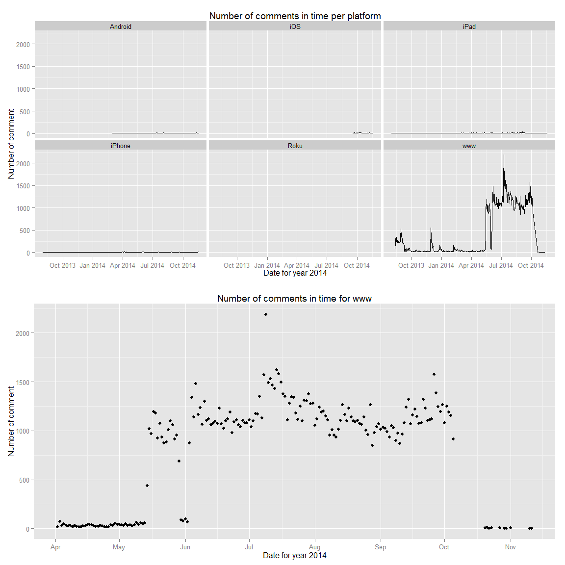 churn_www<-ggplot(aes(x = date, y = n),data = filter(prem.fc_by_date_platform,platform=="www",date>c("2014-04-01"))) + geom_point()+ggtitle("Number of comments in time for www")+ylab("Number of comment")+xlab("Date for year 2014")