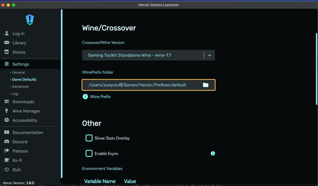 export HOMEBREW_PREFIX="/usr/local"; eval "$(/usr/local/bin/brew shellenv)"to my~/.zprofileprior to installing homebrew (and after installing, making sure the only warningbrew doctorreports is “Warning: You are using macOS 14.”).WINEPREFIX=~/satisfactory arch -x86_64 brew --prefix game-porting-toolkit /bin/wine64 winecfgis meant to be:~/satisfactory— Heroic seems to create its own under~/Games/Heroic/Prefixes/default/Satisfactory Early Access. Should I be using that prefix in Heroic's game settings for WinePrefix folder, or am I missing something else?~/satisfactoryas my game's WinePrefix in Heroic, so I also had to hit the WINECFG button and change Windows Version to Windows 10 (Satisfactory was complaining on launch that DX12 isn't supported prior to that).Again, thanks for the write-up!